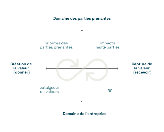 Premier fait marquant de ce modèle : la notion de valeur (axe des X) est divisée en deux. Elle peut être créée et capturée. Elle peut aussi avoir des effets positifs auprès de plusieurs parties prenantes : entreprise, actionnaires, employés, société et citoyens, mais aussi pour l’entreprise et l’actionnariat uniquement (axe des Y). En d’autres mots, certains investissements peuvent servir à créer de la valeur qui ne bénéficie pas directement aux actionnaires à court terme.